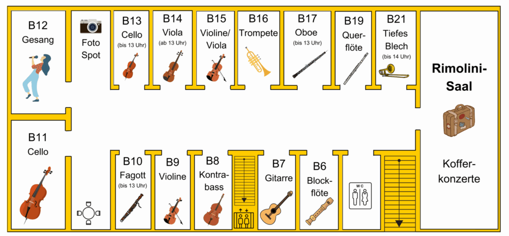 Bei der Instrumentenrallye können Instrumente ausprobiert werden. Die Lehrkräfte der MuKs stehen den ganzen Tag über für Beratung und Unterstützung zur Verfügung.