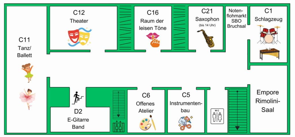 Am Samstag, 25. April 2026, lädt die MuKs von 10 bis 16 Uhr zum großen Aktionstag ein. Kinder, Familien und Interessierte können in den Räumen der MuKs Bruchsal stöbern, staunen und ausprobieren. Höhepunkte sind die Mitmach-Konzerte im Rimolini-Saal, bei denen spannende Geschichten mit echter Musik erzählt werden, sowie das Instrumenten-Ausprobieren unter dem Motto „Trau dich!“. Lehrkräfte beraten den ganzen Tag, die Kunstschule öffnet ihre Türen. Food-Trucks, eine Open-Air-Bühne und der „Raum der leisen Töne“ runden das Programm ab.