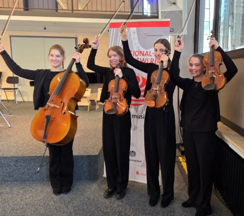 Das Streichquartett der MuKs freut sich über einen ersten Preis und eine Weiterleitung zum Landeswettbewerb (v.l.n.r.: Felicitas Bregler, Eva Wild, Julia Weindel, Sophie Liske)